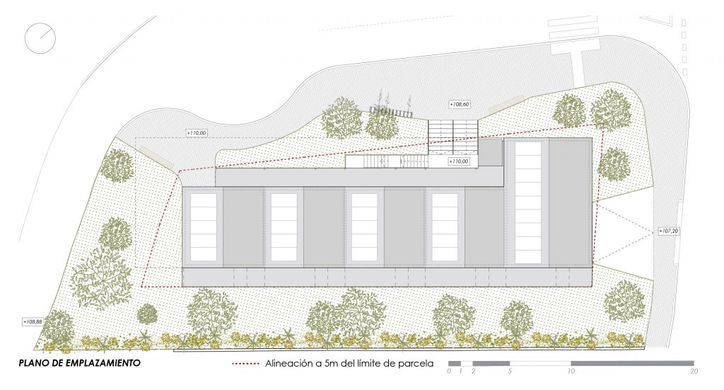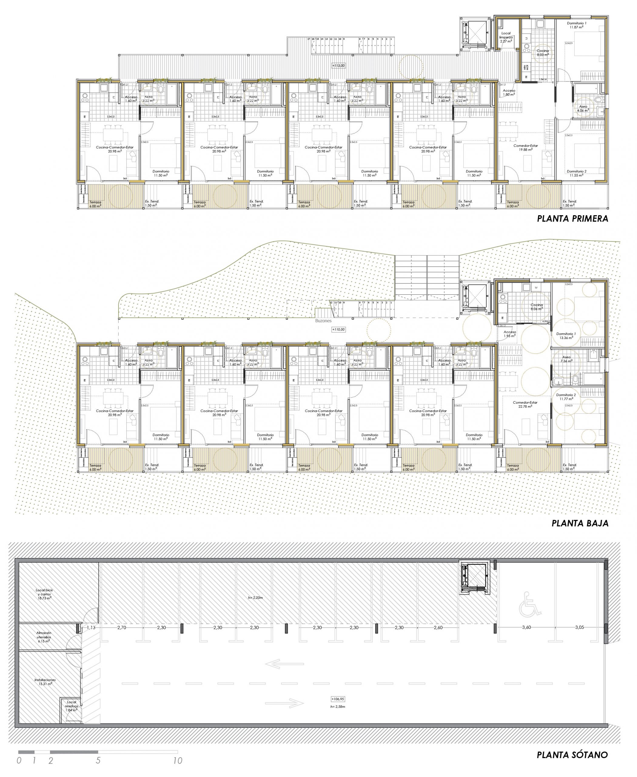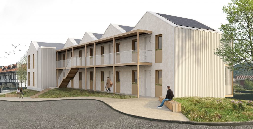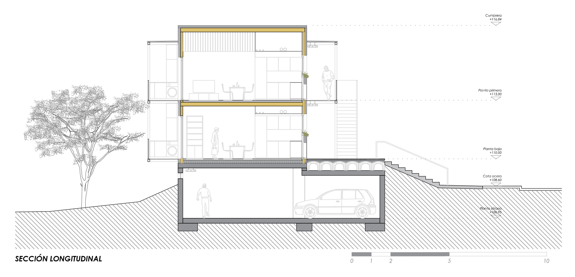 Eraikinaren ezarpena lurzatiaren maldari egokitzen zaio, eta haren bolumetria bi isurialdeko estalkien seriazio baten bidez zatikatzen da, eskala txikiko bizitegi-imajinario batera eramanez. Barne-antolaketarako, galeria-tipologia bat erabiltzen da, eta, horri esker, orientazio bikoitzeko eta aireztapen gurutzatuko etxebizitzak egin daitezke, eta, aldi berean, komunitate-espazio argia, irisgarria eta segurua sortzen da.