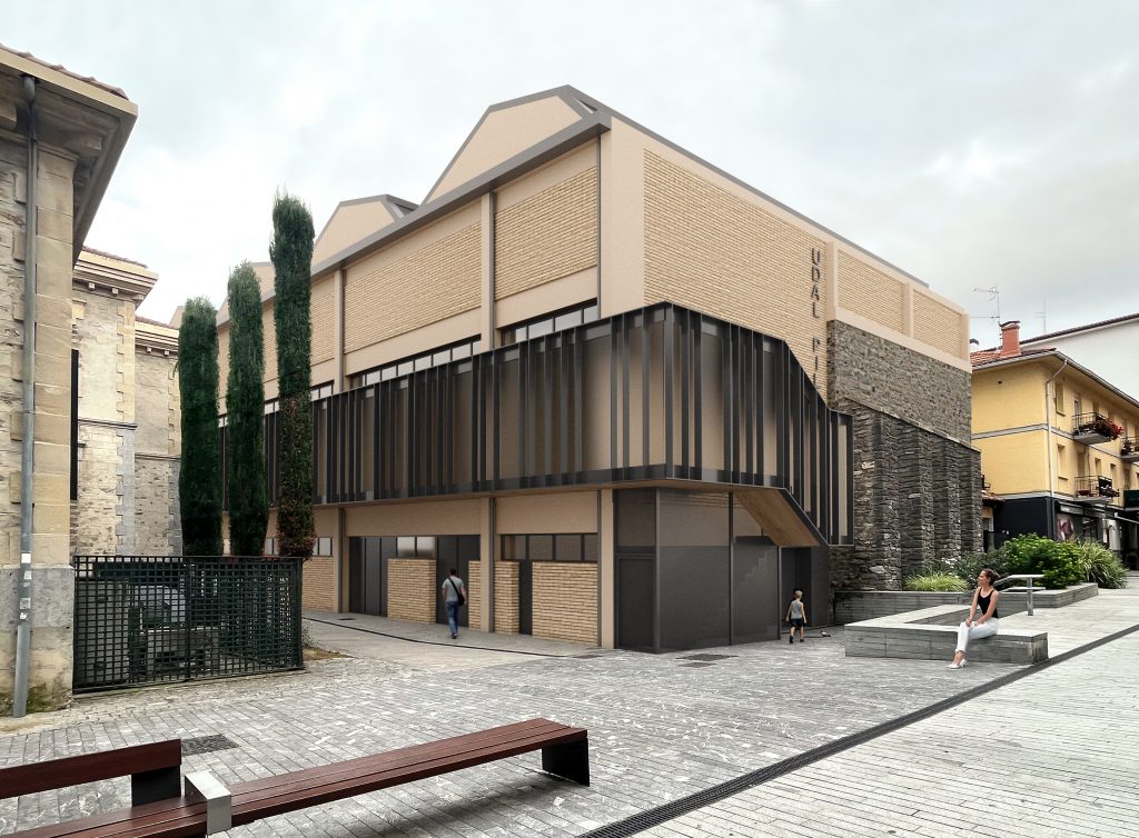 Proposamena osatzeko, bolumen arin berri bat proposatu da, sarbideak berrantolatzeko eta barne-funtzionaltasuna eguneratzeko. Bolumen hori hegan doan metalezko pasabide baten bidez gauzatzen da. Pasabide horrek luzetarako altxaera berri bat zehazten du, Larrinaga kalerantz eta plazarantz. Xafla bertikalez itxitako metalezko egiturak erritmo garaikidea sortzen du, lehendik dagoen eraikinaren modulazioarekin hitz egiten duena, eta sendotasunaren eta gardentasunaren arteko oreka ezartzen du. Aurrealde berri horrek fatxada aktibo gisa jokatzen du, plazara eta oinezkoentzako espaziora irekia, eta beheko argiztapen lineala integratzen du, inguruaren segurtasuna eta gaueko pertzepzioa indartzeko.