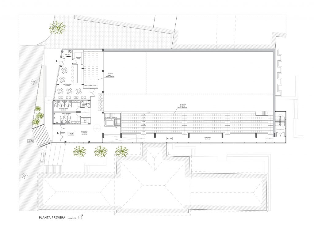 Lehenengo solairuan sarbide nagusi berria dago, kalera eta plazara irekia, baita harremanetarako espazio gisa sortutako atari bat ere. Maila horretan dago taberna-taberna ere, sarbide independentea eta fatxada aktiboa dituena espazio publikorantz. Ataritik harmailetara doan pasabide irtenera iritsiko gara, kantxatik ibilbiderik egin gabe. Erreboteko horman luzetarako arrakala bat dago, bolumen berria frontoiaren espazioarekin bisualki lotzen duena, begiratoki bat eta harmaila gehigarri bat sortuz.