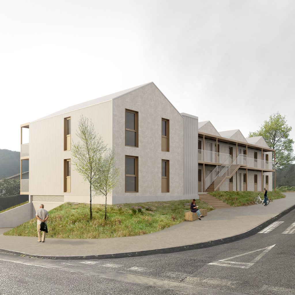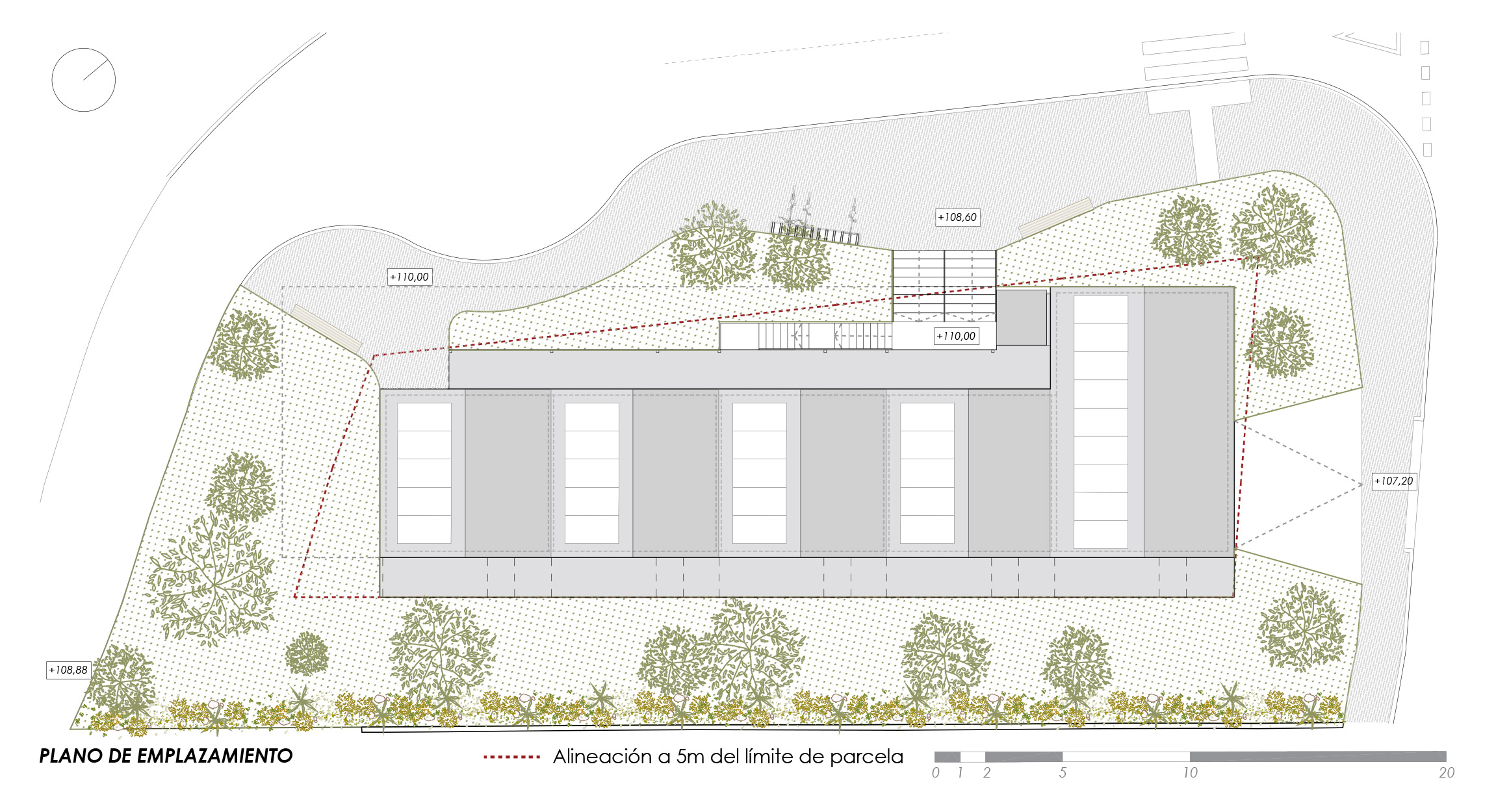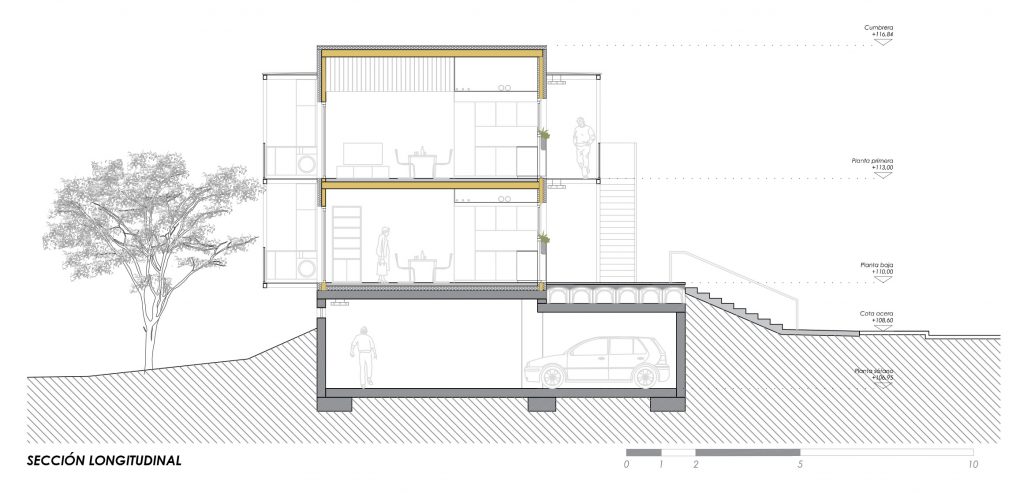 La implantación del edificio se adapta a la pendiente de la parcela, fragmentando su volumetría mediante una seriación de cubiertas a dos aguas que remite a un imaginario residencial de pequeña escala. La organización interior se resuelve mediante una tipología en galería, que permite viviendas pasantes con doble orientación y ventilación cruzada, generando al mismo tiempo un espacio comunitario claro, accesible y seguro.
