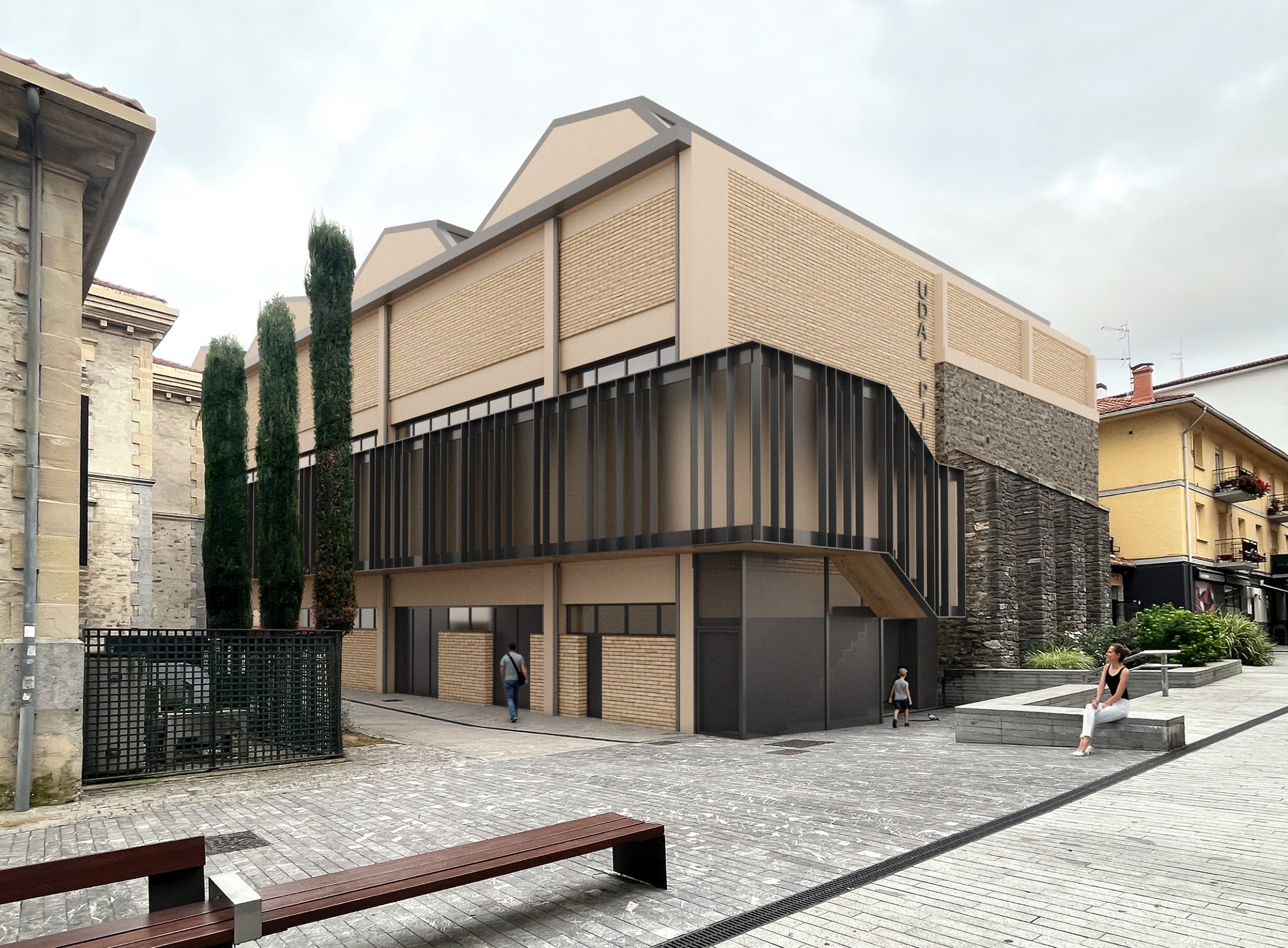 La propuesta se completa con un nuevo volumen de carácter ligero, destinado a reorganizar los accesos y actualizar la funcionalidad interior. Este volumen se materializa mediante una pasarela metálica en vuelo que define un nuevo alzado longitudinal hacia la calle Larrinaga y la plaza. Su estructura metálica con cerramiento de lamas verticales genera un ritmo contemporáneo que dialoga con la modulación del edificio existente, estableciendo un equilibrio entre solidez y transparencia. Este nuevo frente actúa como una fachada activa, abierta a la plaza y al espacio peatonal, integrando iluminación lineal inferior que refuerza la seguridad y la percepción nocturna del entorno.