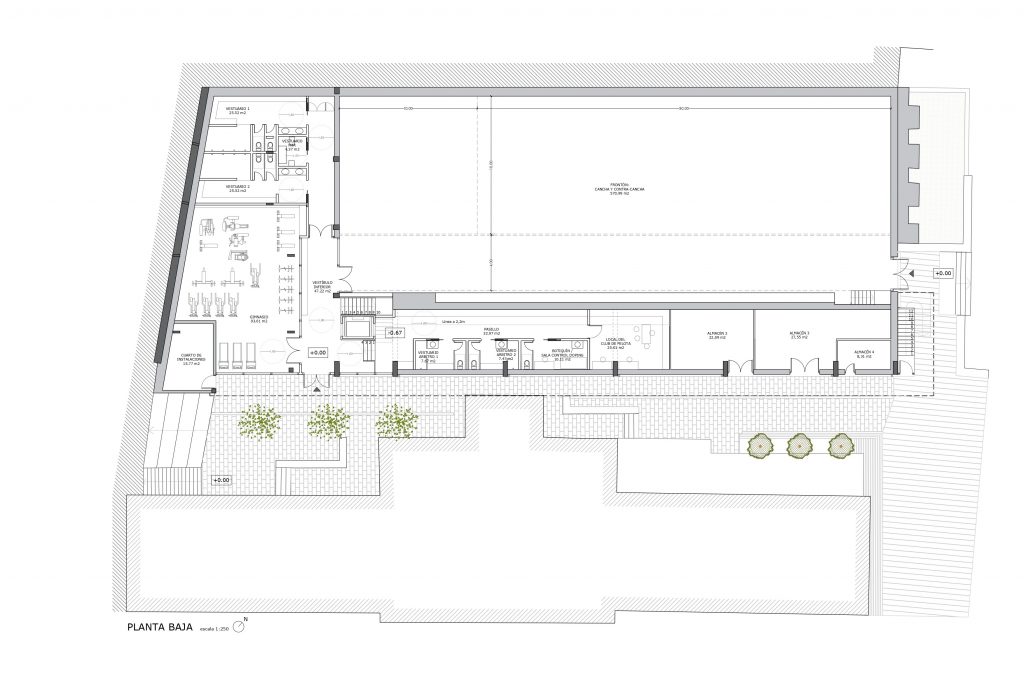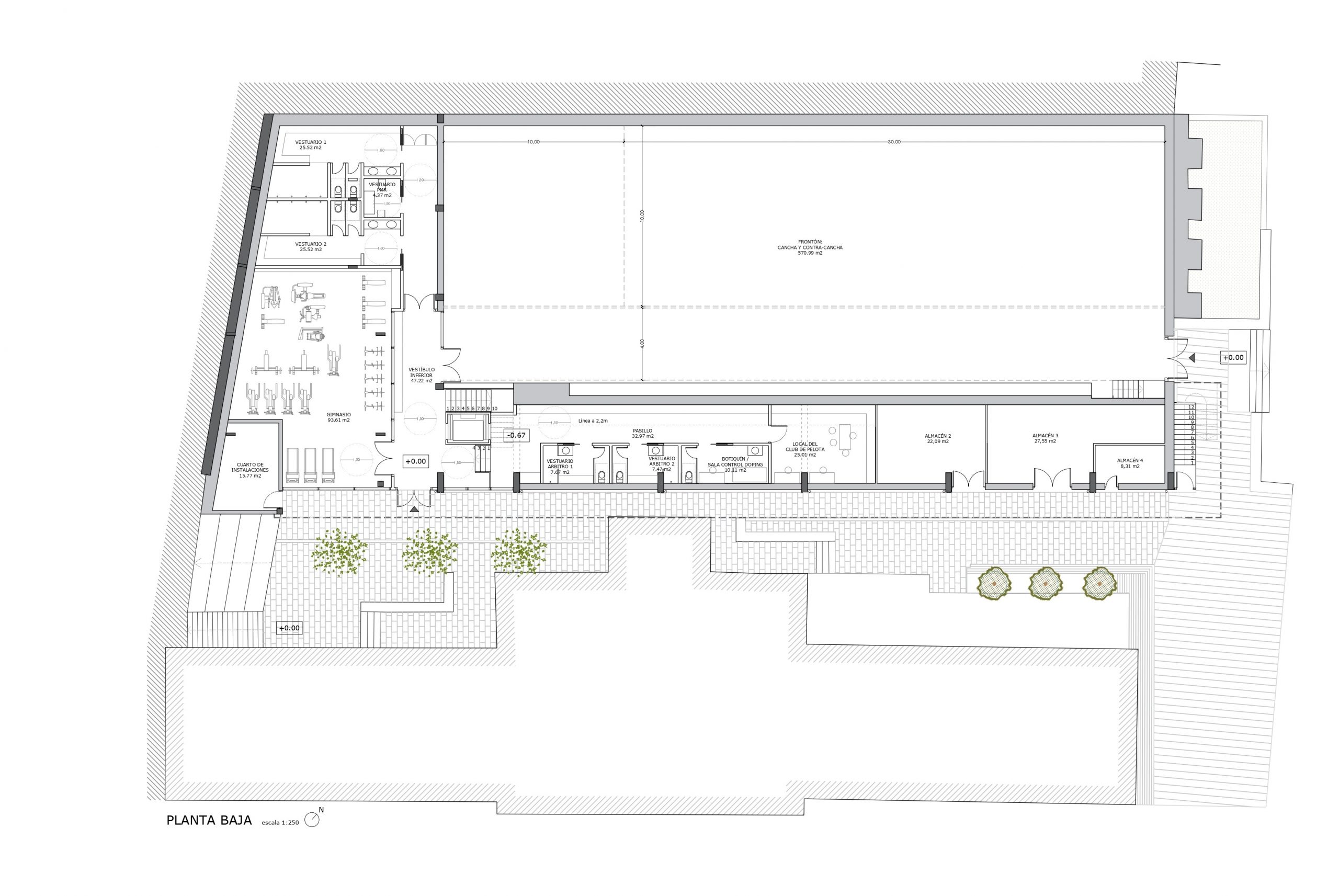 En planta baja se concentran los usos deportivos y de servicio, con vestuarios para ambos sexos, vestuario adaptado y un nuevo gimnasio con fachada abierta al exterior. Un acceso independiente permite el uso autónomo de estas dependencias, diferenciando claramente los recorridos de deportistas y público. Bajo el graderío se sitúan los vestuarios de árbitros, botiquín, control antidopaje y las oficinas del club de pelota, completando el programa funcional.